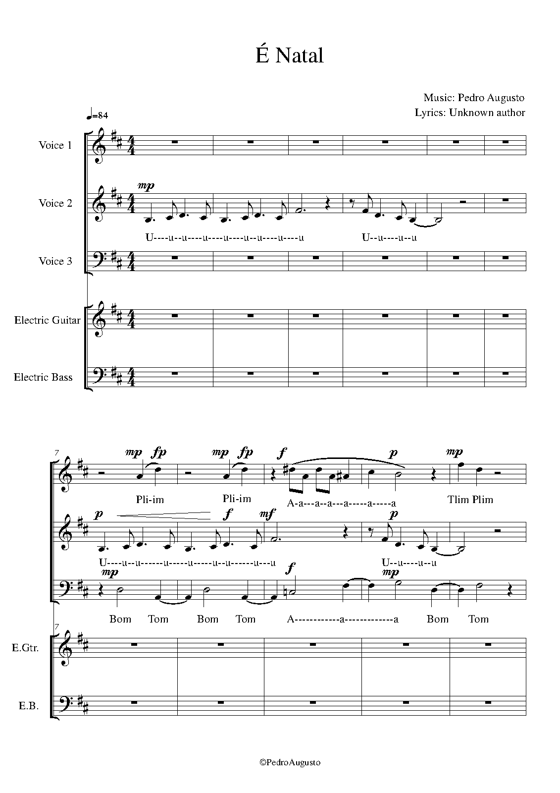 This composition is part of an Album collection that will be first published as a four-volume score music book entitled "Fluxo-inspiration: 35 years of songs" (in Portuguese, its published language: "Fluxo-inspiracao: 35 anos de musica") containing the following four volumes: I) Love & Peace (13 compositions); II) Ecology & Fado (12 compositions); III) Rock & Blues (13 compositions); IV) Instrumentals (13 compositions). É Natal ("It is Christmas") was composed in 2020. It will be included in the volume I, part 3 of the Album collection.