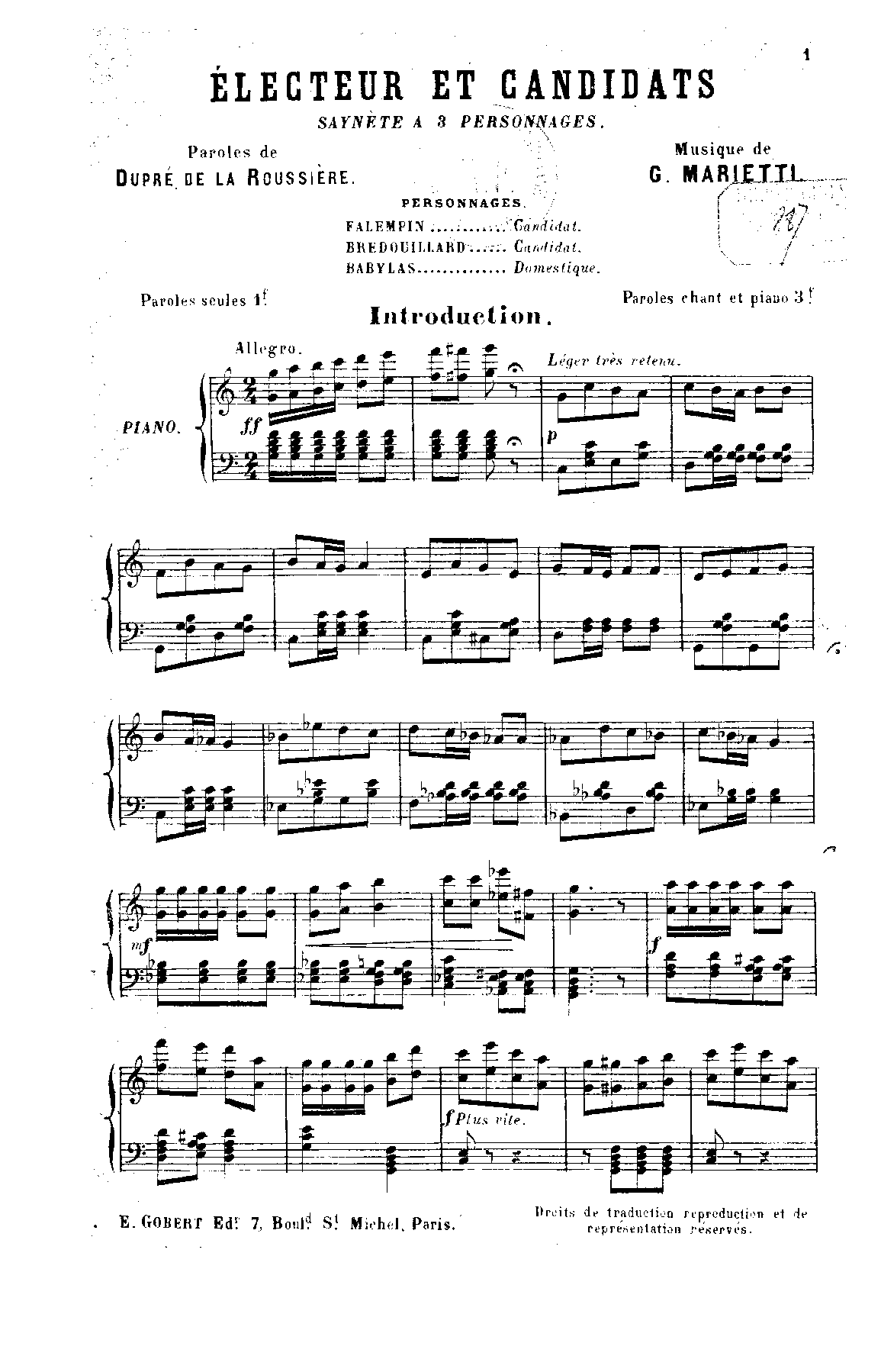 | Copyright Information | Publication noted in the Bibliographie de la France : 84e année, 2e série, Nº 16, 20 Avril 1895, p.251, reg.1888 (vocal score). |