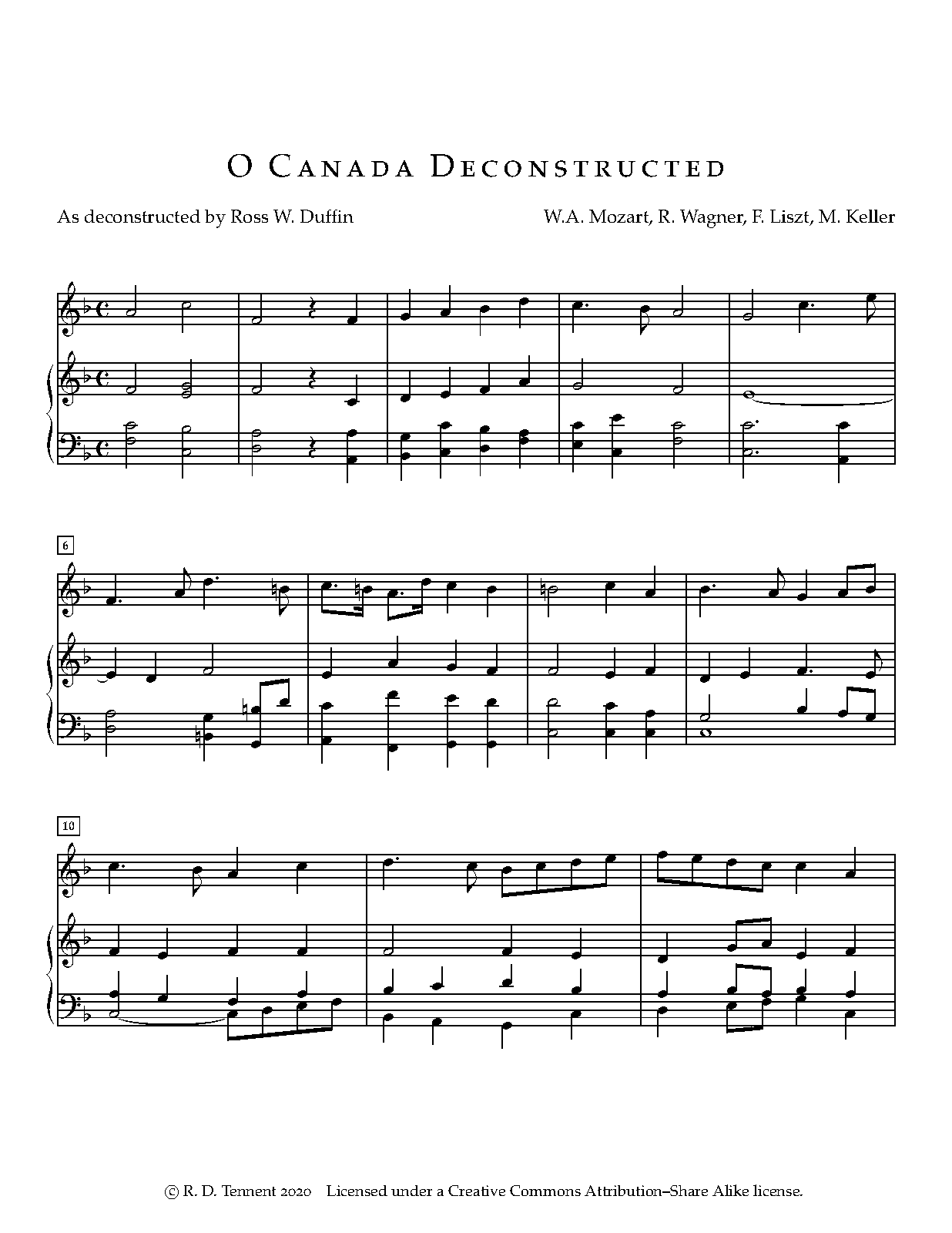 Musicologist Ross Duffin has suggested https://doi.org/10.1093/musqtl/gdaa004 that Lavalée constructed the melody for O Canada by adapting material by Mozart (March of the Priests, measures 1-8), Liszt (Festklänge, measures 17-20), Wagner (Wach auf, es nahet gen den Tag, measures 9-16), and Matthias Keller (The American Hymn, measures 21-28). |