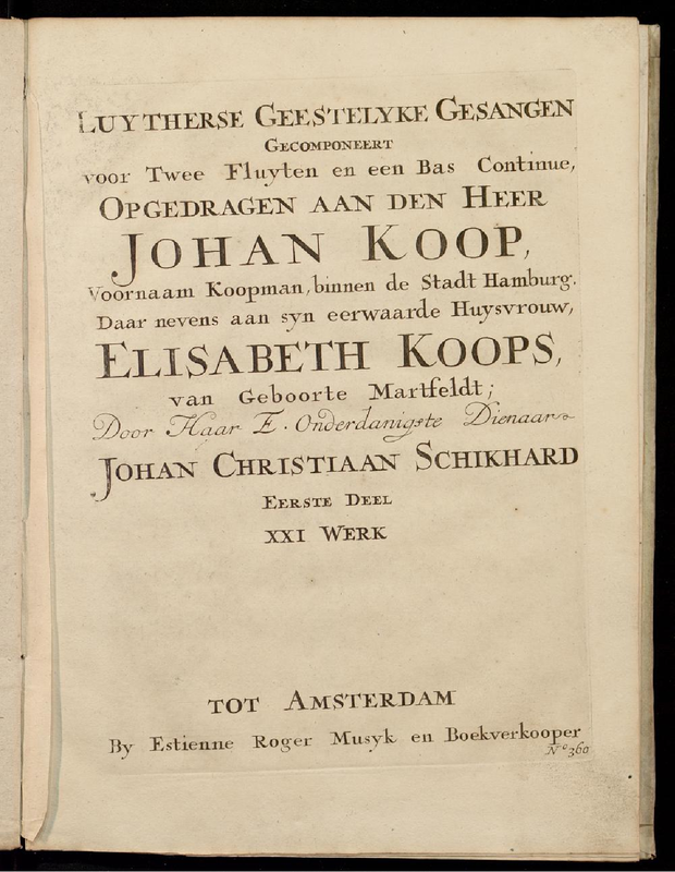 | Alternative. Title | Luytherse Geestelyke Gesangen gecomponeert voor Twee Fluyten en een Bas Continue ... Eerste Deel XXI Werk |