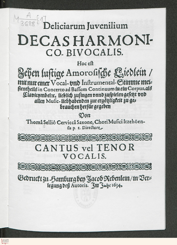 Deliciarum Juvenilium Decas Harmonico-Bivocalis. Hoc est Zehen lustige Amorosische Liedlein, mit nur einer Vocal- und Instrumental-Stimme meistentheils in Concerto ad Bassum Continuum in ein Corpus, also Clavicymbel &c. lieblich zusingen unnd zuspielen gesetzt und allen Music-liebhabenden zur ergoetzligkeit zu gebrauchen herfuer gegeben