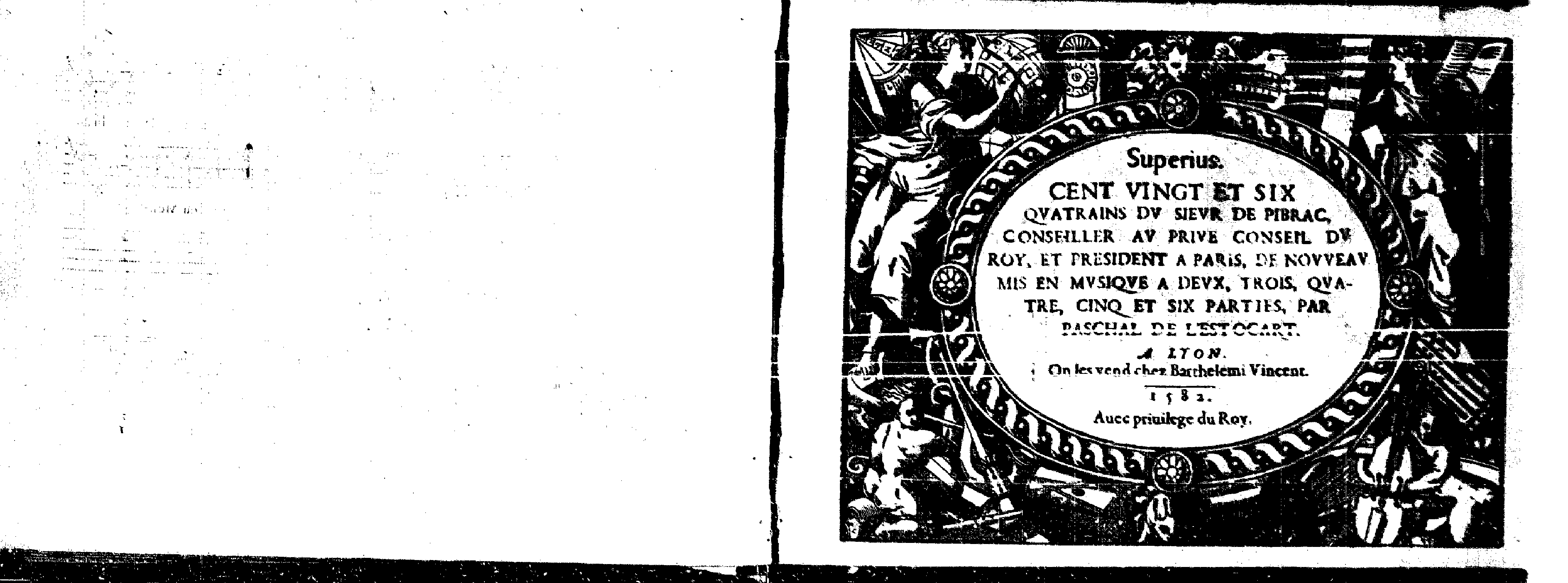 | Alternative. Title | Cent vingt et six quatrains du sieur de Pibrac, conseiller au privé Conseil du Roy, et president à Paris, de nouveau mis en musique à deux, trois, quatre, cinq, et six parties, par Paschal de L'Estocart. |