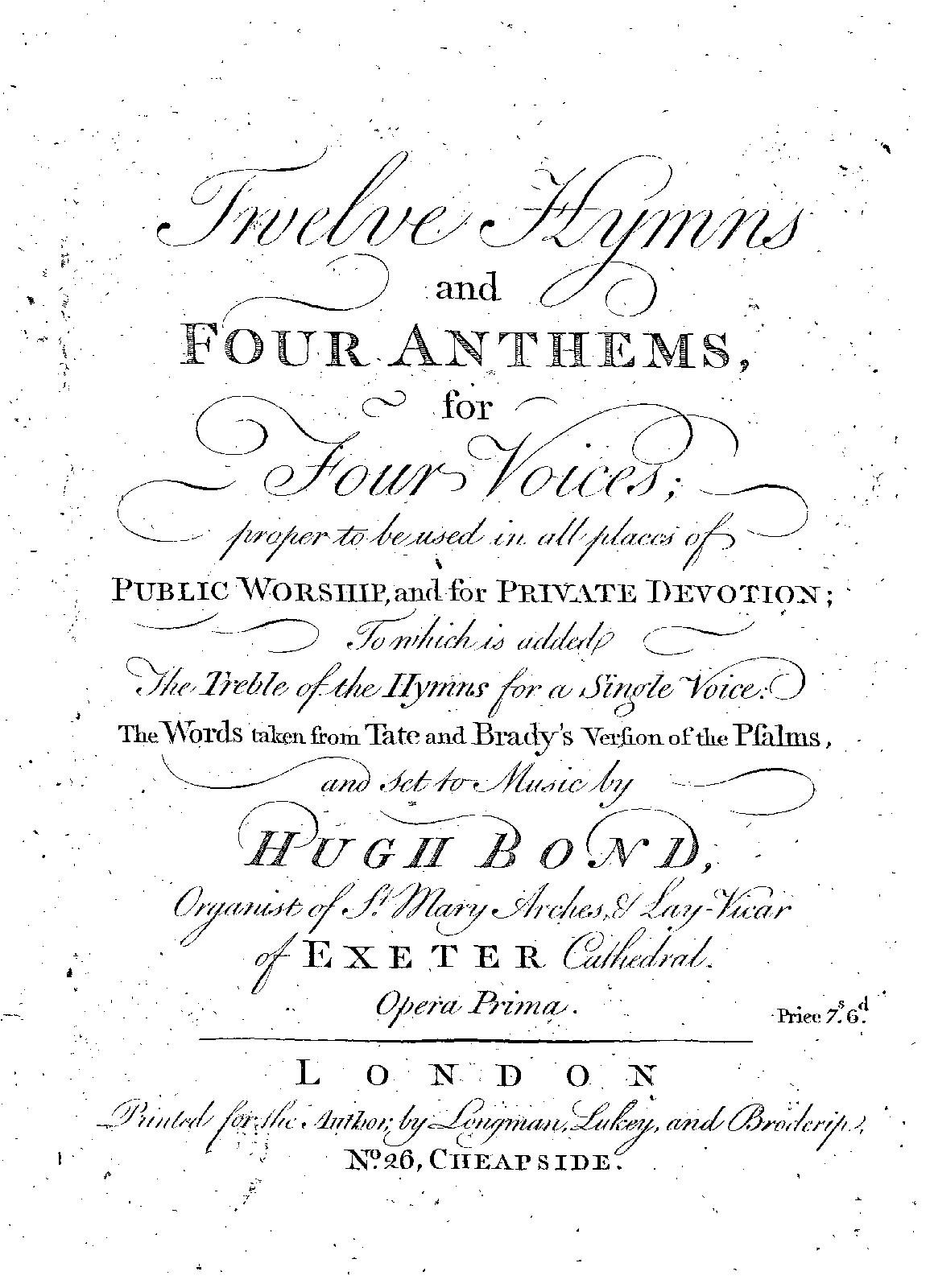 12 Hymns and 4 Anthems, for 4 Voices; proper to be used in all places of Public Worship, and for Private Devotion; to which is added The Treble of the Hymns for a Single Voice. The Words taken from Tate and Brady's Version of the Psalms