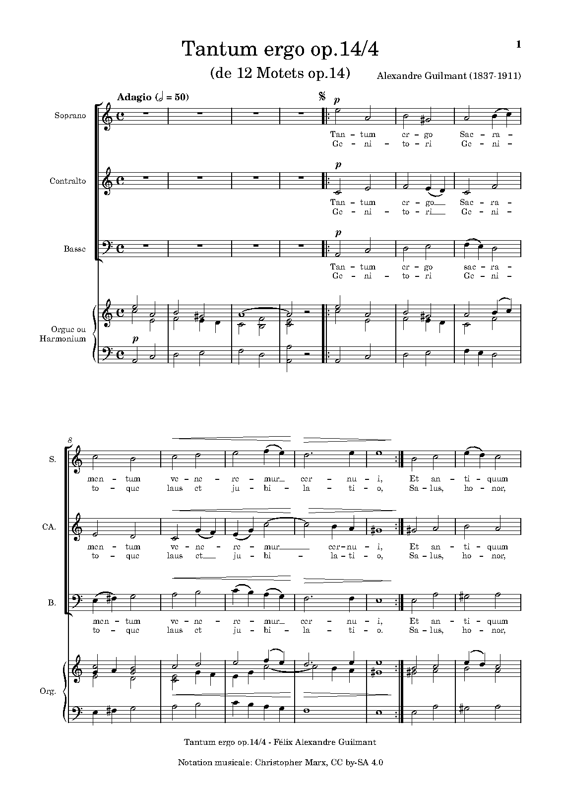 Instrumentation 1, 2, 3 and 4 voices (soli and chorus) and organ or harmonium