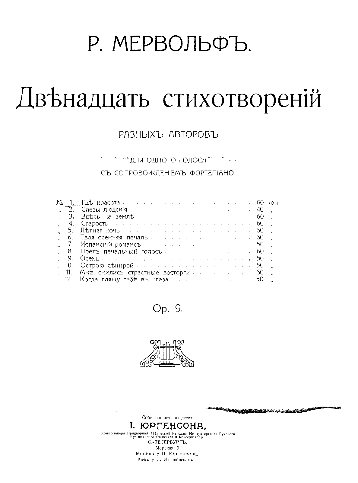 Двенадцать романсы разных авторов для одного голоса с сопровождением фортепиано