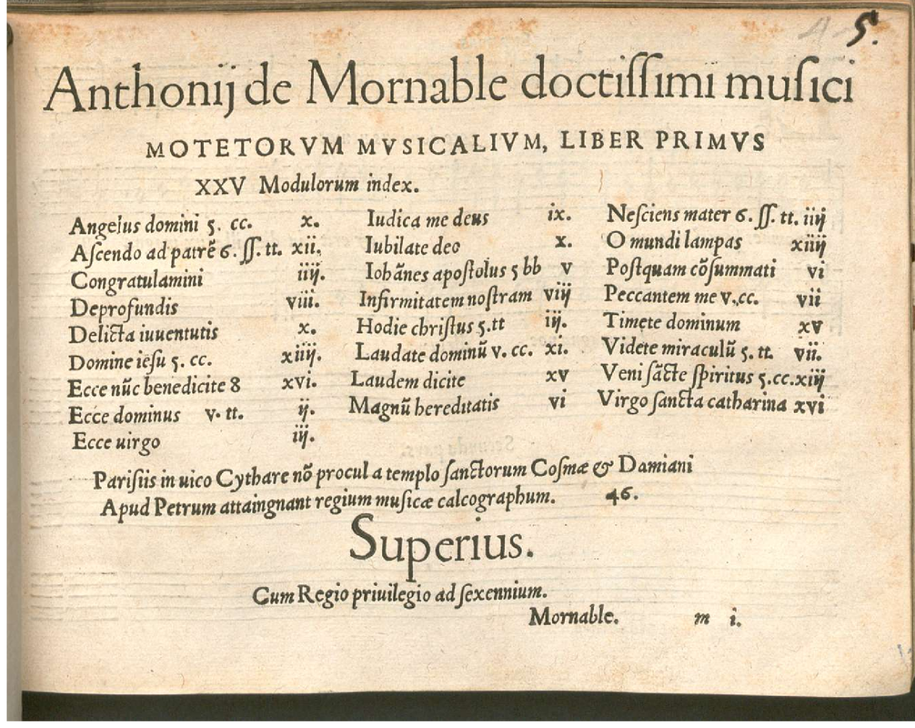 | Alternative. Title | Anthonij de Mornable doctissimi musici Motetorum musicalium, liber primus |