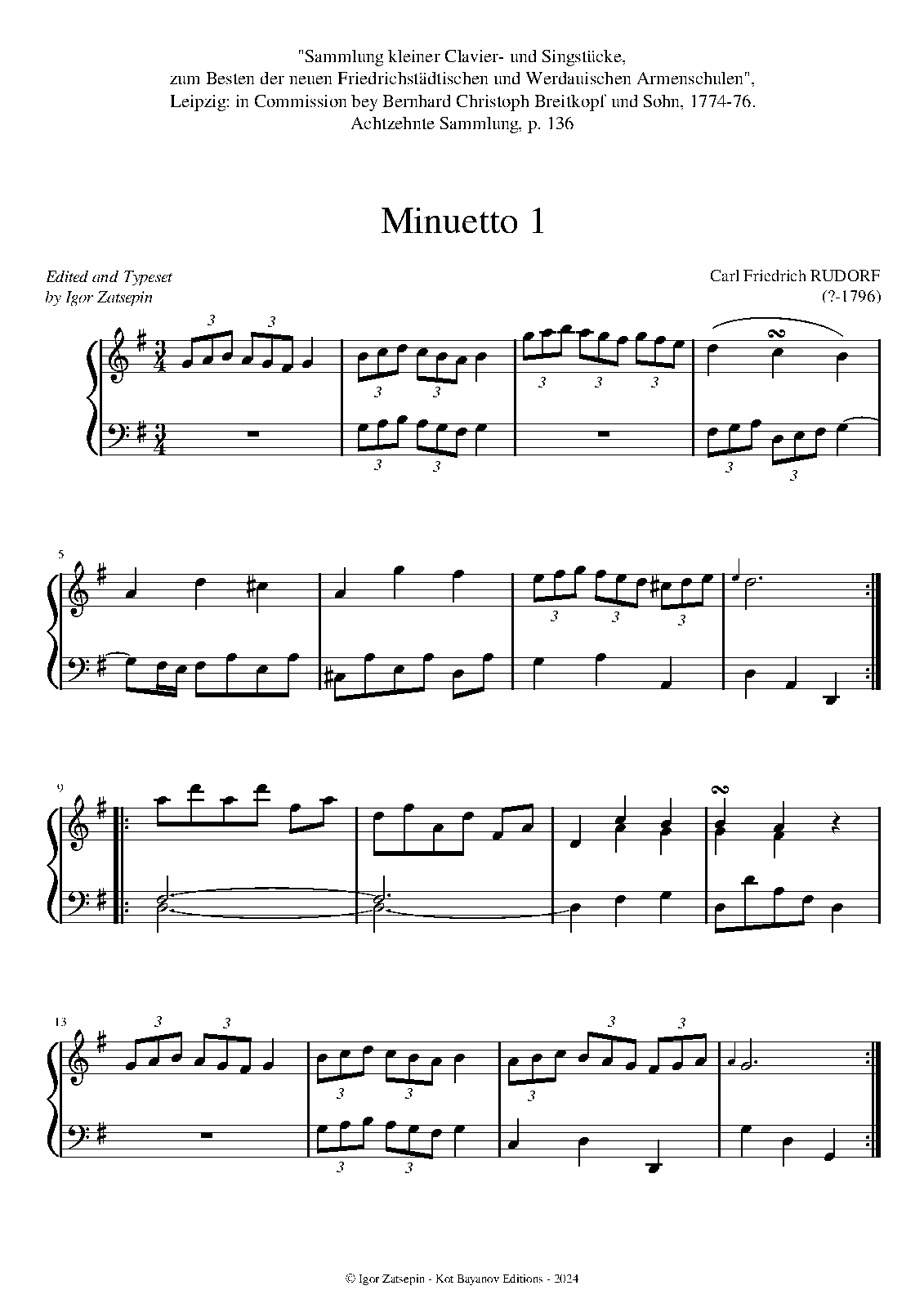 | Extra Information | "Sammlung kleiner Clavier- und Singstücke...", Breitkopf und Sohn, 1774-76 |