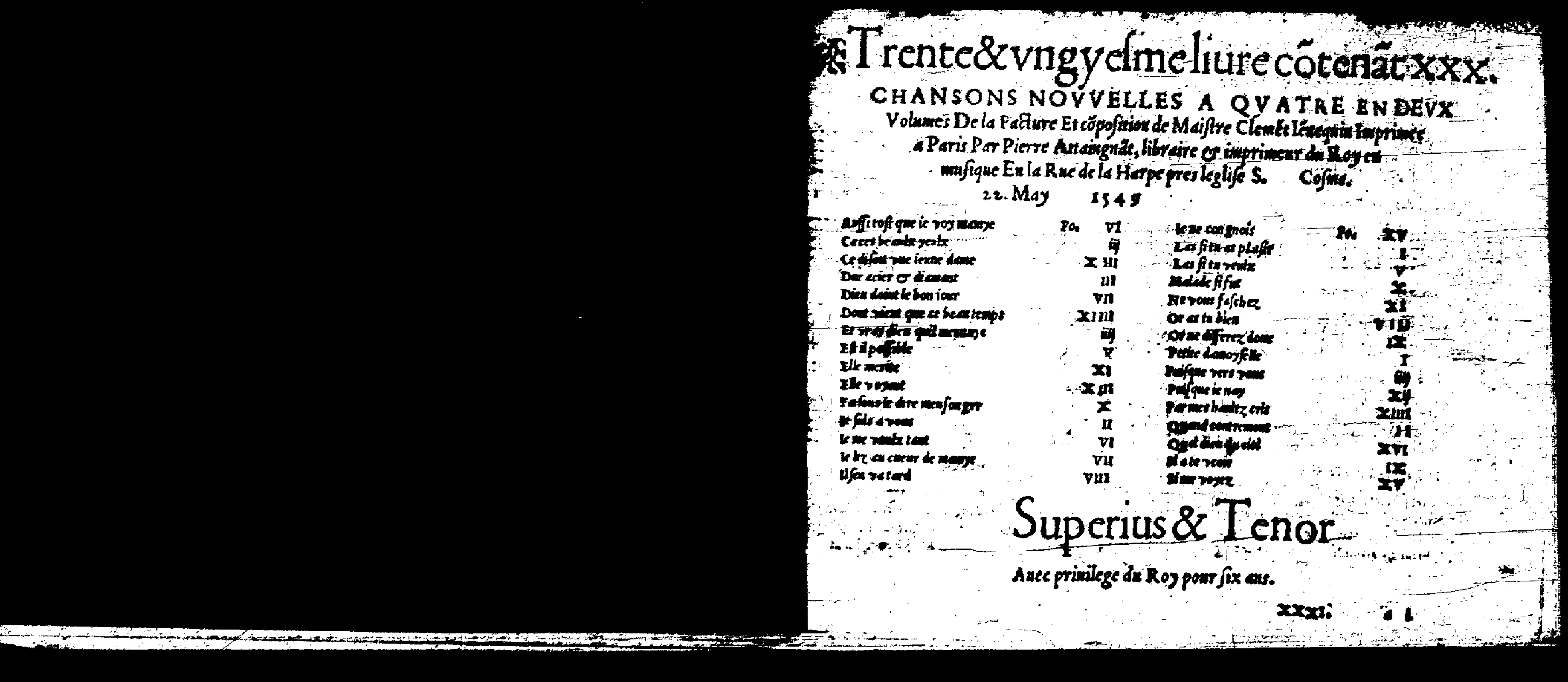 | Alternative. Title | Trente et ungyesme livre contenant XXX chansons nouvelles ; Trente & ungyesme livre cõtenãt XXX chansons nouvelles a quatre en deux volumes de la facture et cõposition de Maistre Clemẽte Iẽnequim |