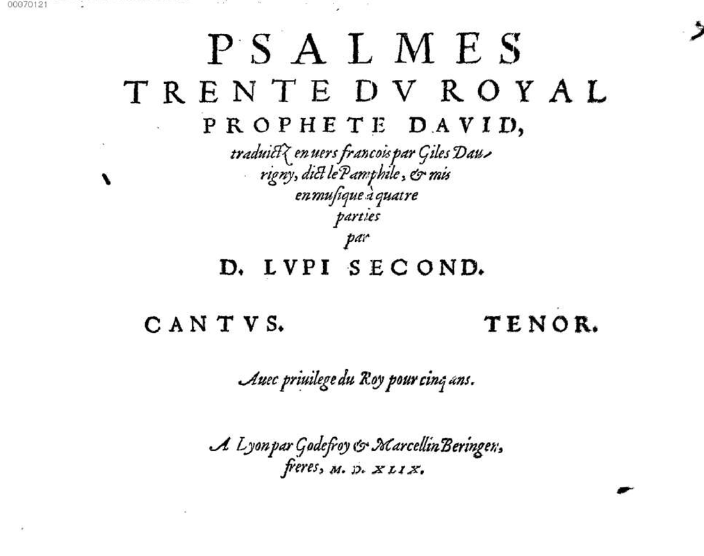 | Alternative. Title | Psalmes trente du royal prophète David, traduictz en vers françois par Giles Daurigny, dict le Pamphile, & mis en musique à quatre parties par D. Lupi Second |