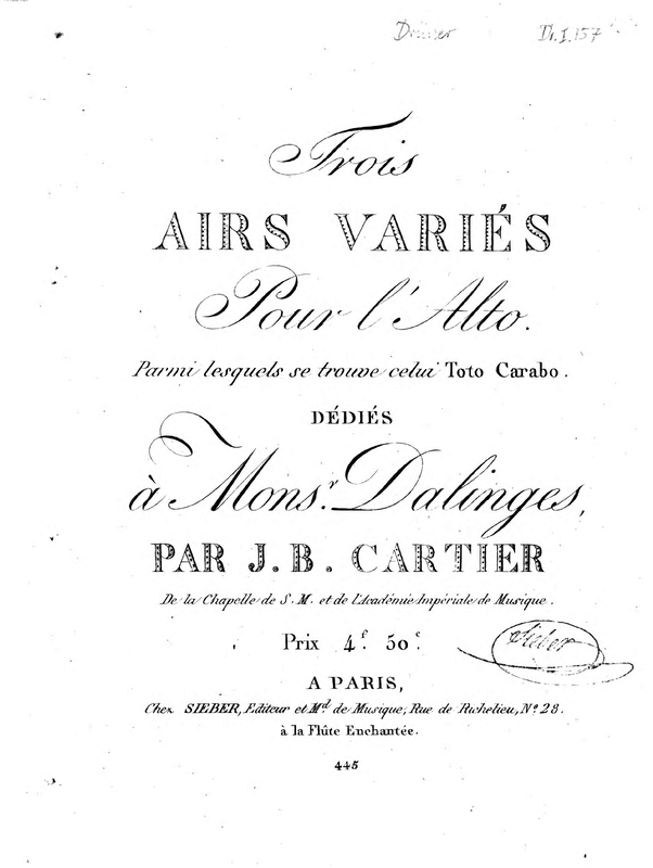 | Alternative. Title | Trois Airs Variés pour l'Alto, parmi lesquels se trouve celui Toto Carabo |