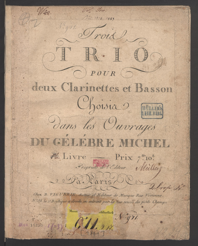 | Alternative. Title | Trois Trio pour deux Clarinettes et Basson Choisis dans les Ouvrages du celebre Michel |