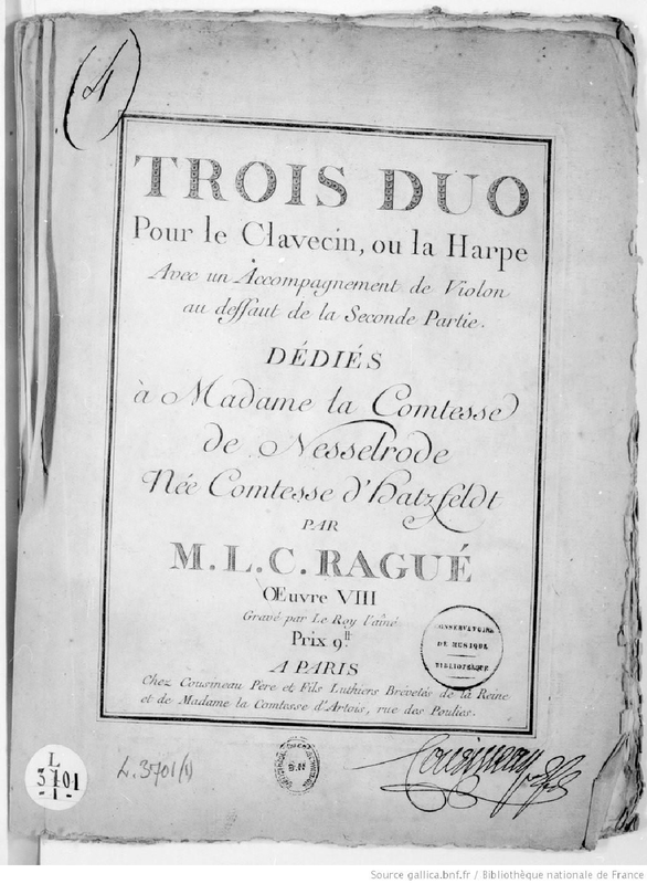 | Alternative. Title | Trois duo pour le clavecin ou la harpe avec un accompagnement de violon au defaut de la seconde partie |