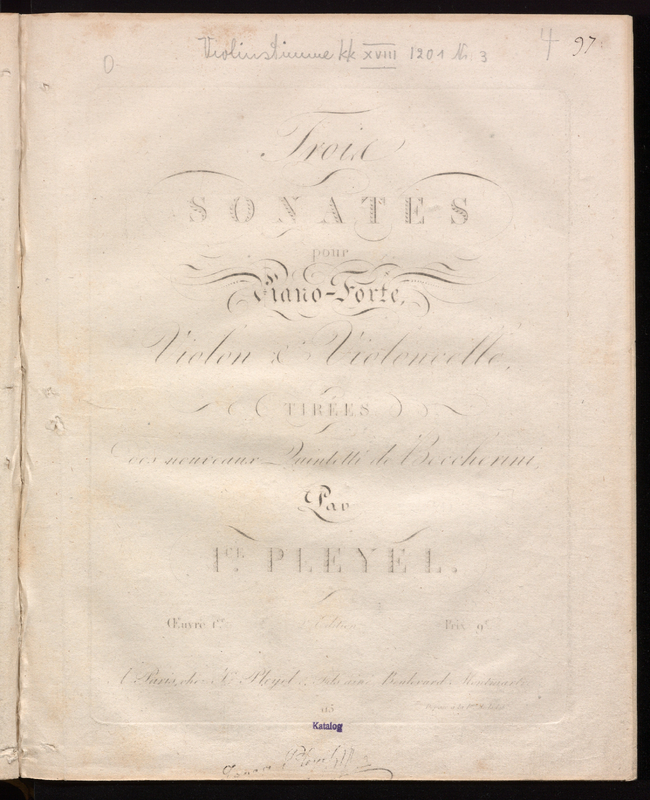 Alternative. Title Trois sonates pour piano-forte, violon & violoncelle tirées des nouveaux quintetti de Luigi Boccherini par I[gna]ce Pleyel. Oeuvre 1er.