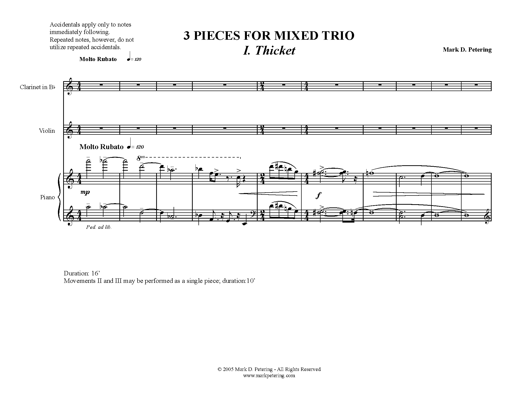 Inspired by the natural world both vast and minute, the first movement, Thicket, was premiered at the Aspen Music Festival in 2005. The entire work featuring the additional movements, Coastline and String Theory, was premiered by the Fifth House Ensemble in October 2008 and recorded for Zebrina Records.