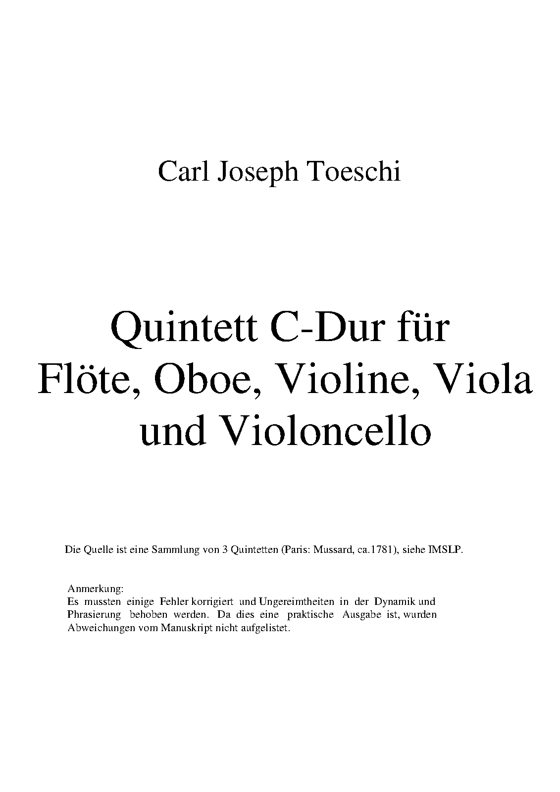 | Genre Categories | Quintets; For flute, oboe, violin, viola, cello; Scores featuring the flute; |