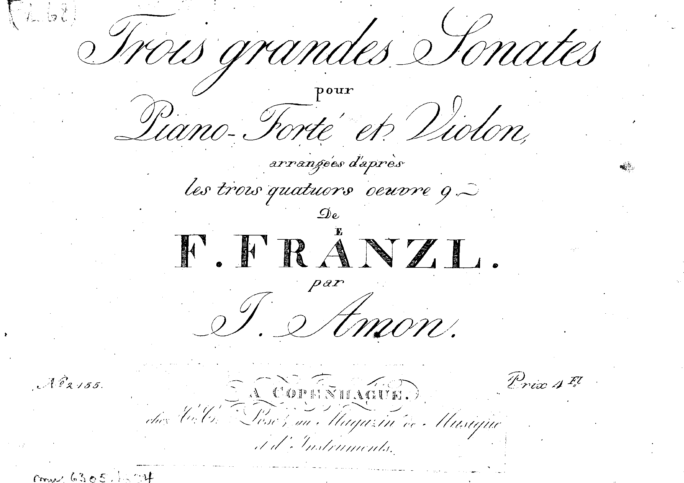 | Alternative. Title | 3 grandes Sonates pour Piano-Forte et Violon, arrangees d'apres les 3 quatuors Op.9 de F. Fränzl, par J. Amon |