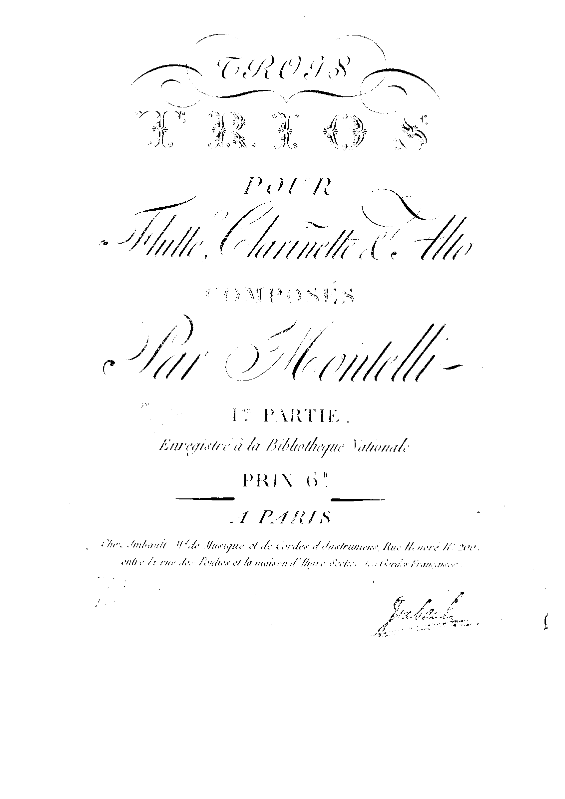 | Alternative. Title | Trois trios pour flute traversiere, clarinette et alto Trois trios pour flute clarinette et alto Op.1 |
