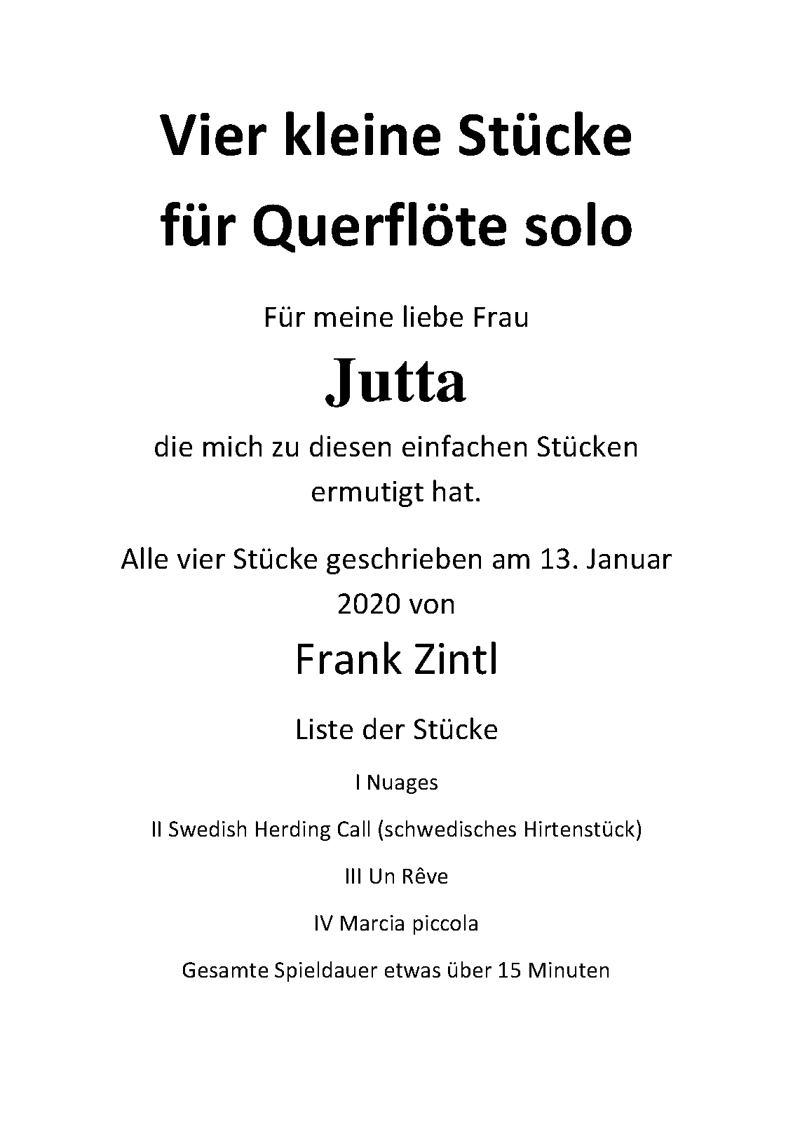 These four pieces for flute and classic acoustic guitar are an arrangement of four pieces for flute solo which have been published here earlier. Frank Zintl decided to make this arrangement 22.-24. August 2020 to make the pieces more attractive for players, but the version for flute solo from 13. January 2020 is still the original one. The version with guitar is an offer to people who prefer a fuller sound. For free use.