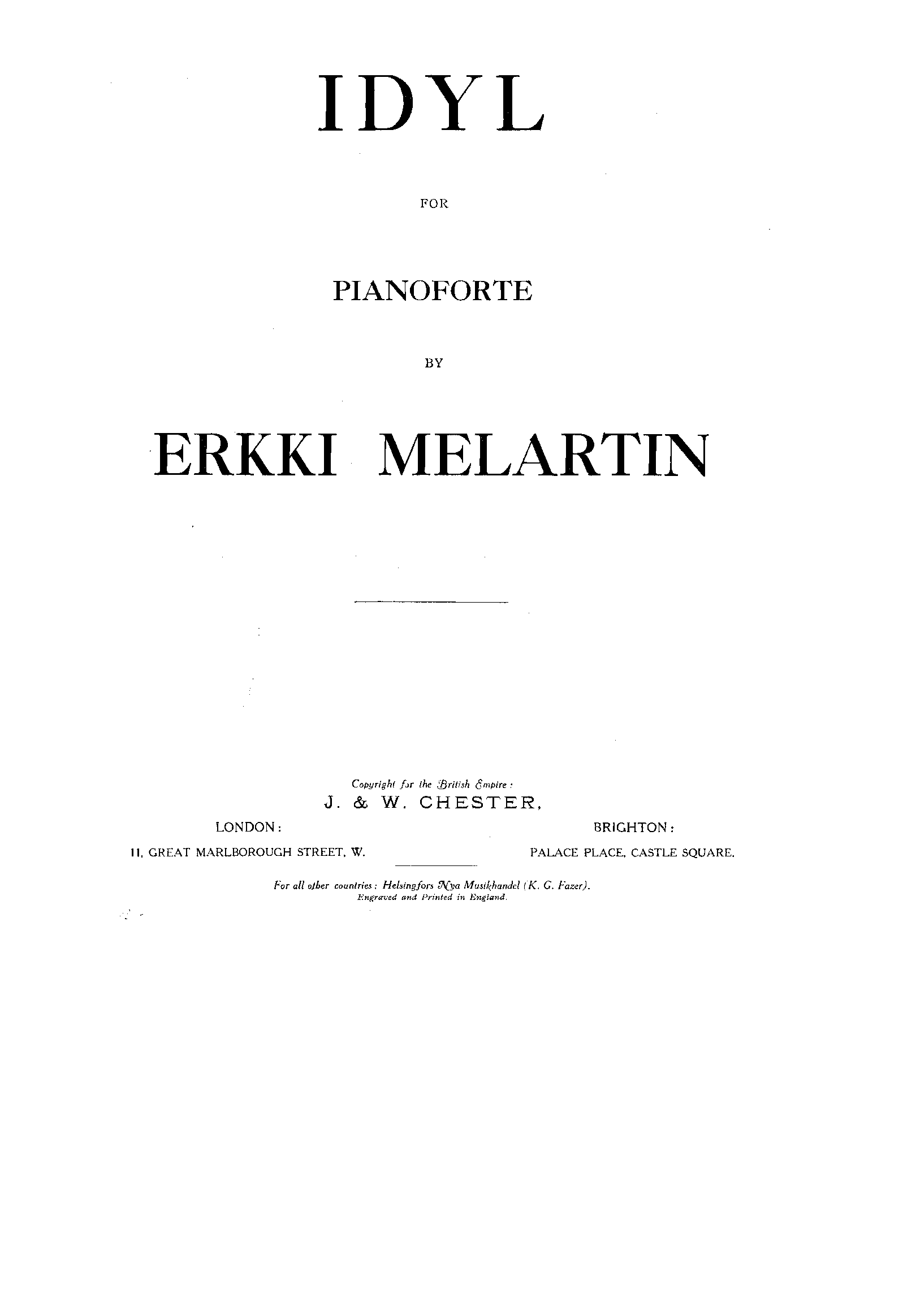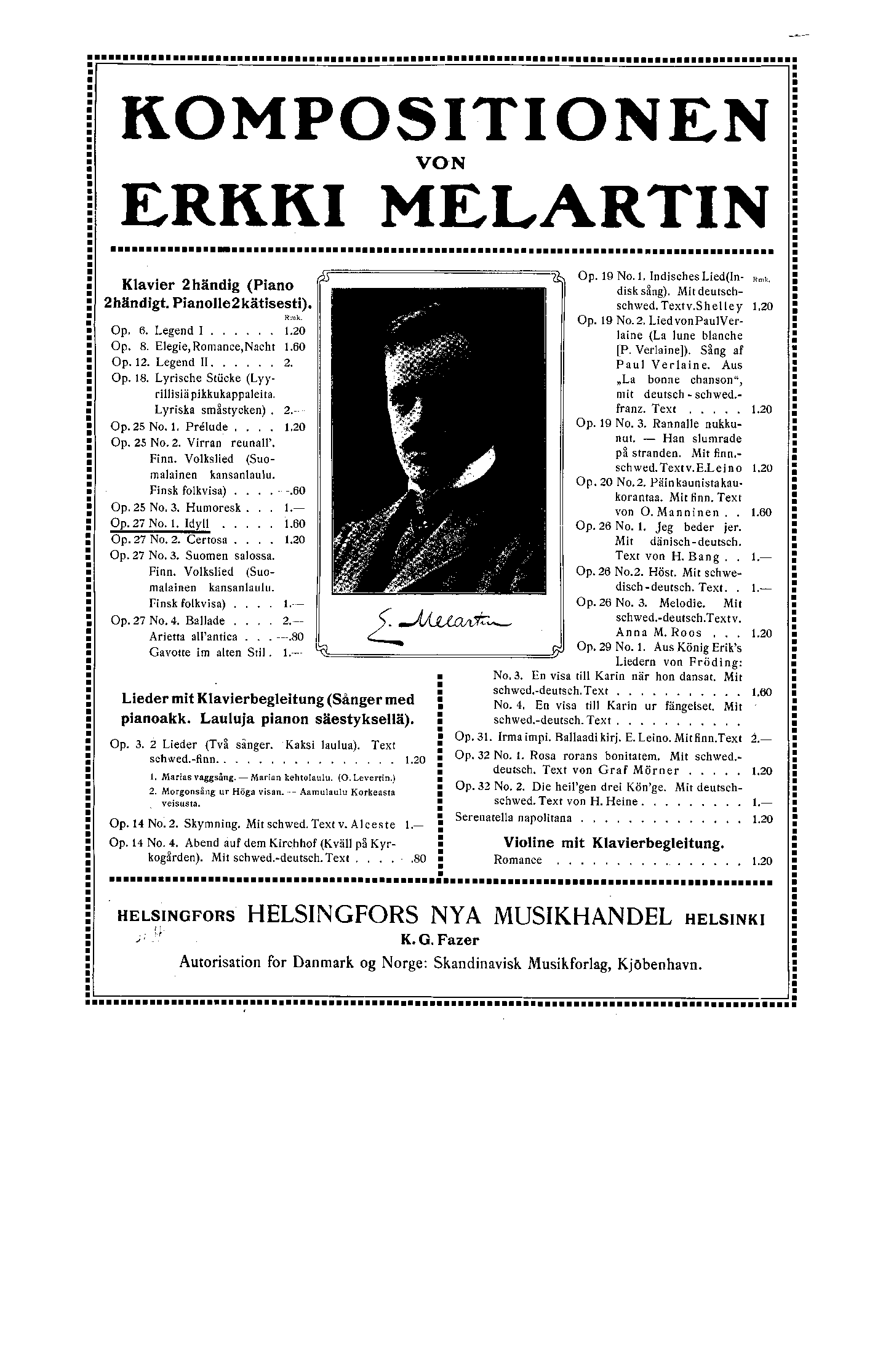 Publisher. Info. Helsinki: Helsingfors Nya Musikhandel, n.d.[1906]. Plates H.N.M. 487–90.