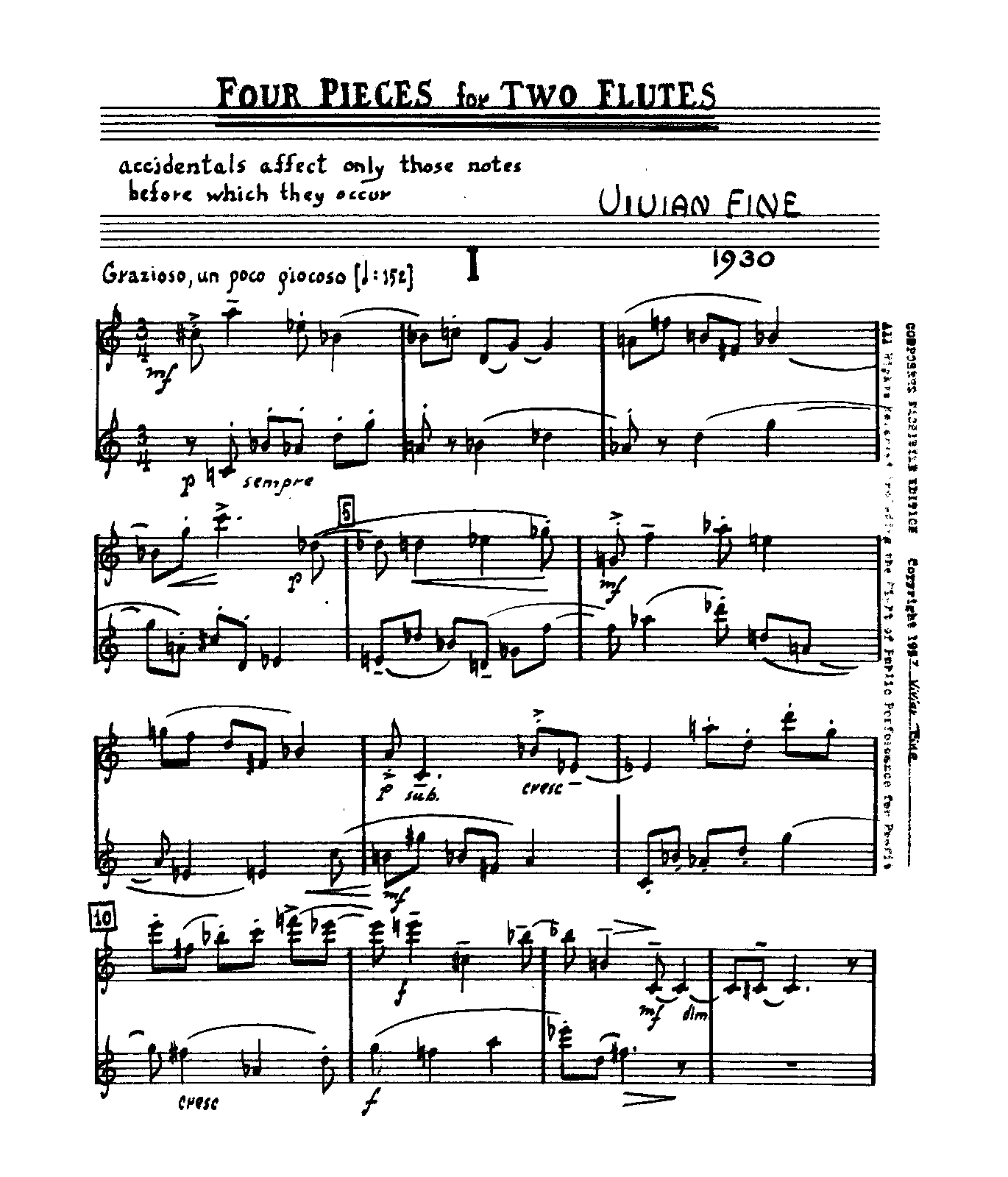 | First Performance. | 1931-12-01, Dessau, Germany (Bauhaus), at the International Society of Contemporary Music’s concert of music by women. This performance marked Fine’s international debut as a composer. She had just turned 18 |