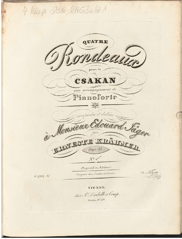 | Alternative. Title | Quatre rondeaux pour le csakan avec accompagnement de pianoforte |