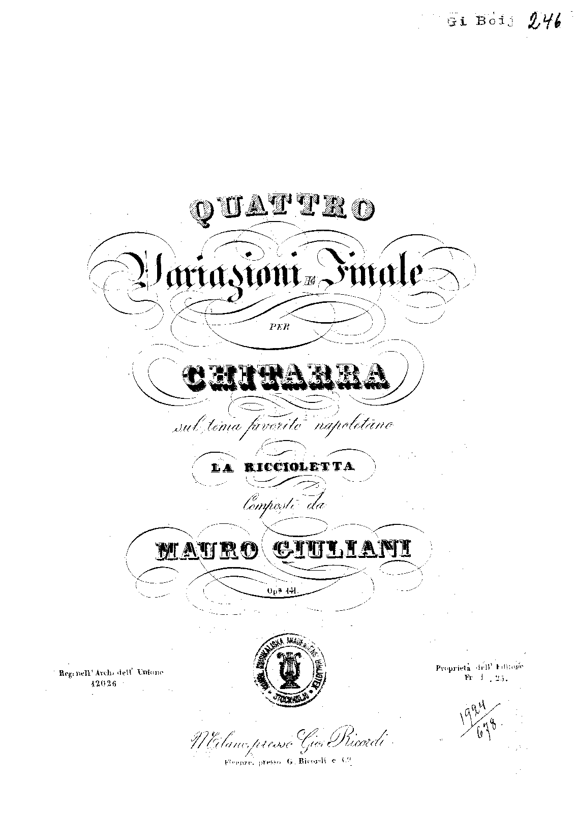 | Alternative. Title | Quattro Variazioni e Finale per Chitarra sul tema favorita Napolitano; La Riccioletta |