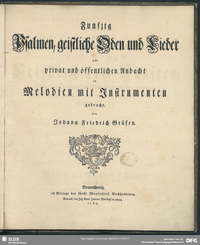 Funfzig Psalmen, geistliche Oden und Lieder zur privat und öffentlichen Andacht in Melodien mit Instrumenten gebracht, von Johann Friedrich Gräfen