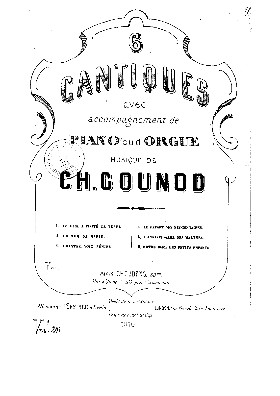 | Alternative. Title | 6 cantiques avec accompagnement de piano ou orgue |