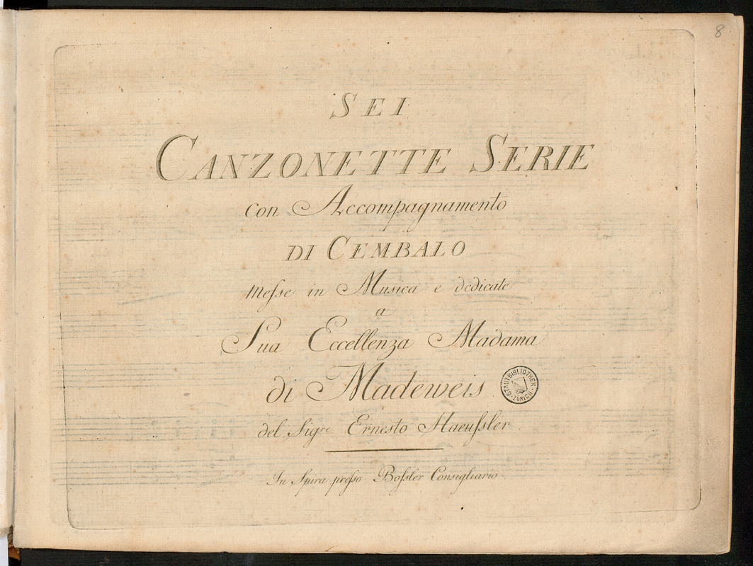 | Alternative. Title | Sei canzonette serie con accompagnamento di cembalo mese in musica e dedicate a Sua Eccellenza Madama di Madeweis. |