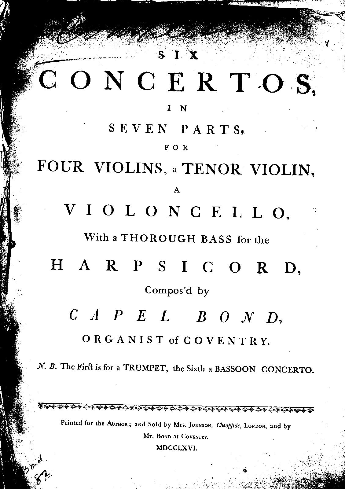 | Work Title | Six Concertos, in Seven Parts, for Four Violins, a Tenor Violin, a Violoncello, with a Thorough Bass for the Harpsicord ... N.B. The First is for a Trumpet, the Sixth a Bassoon Concerto. |