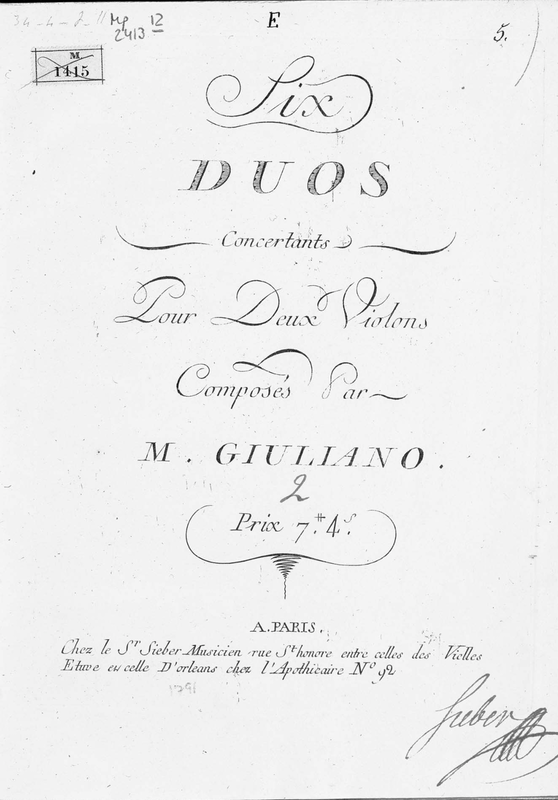 | Alternative. Title | Six duos concertans pour deux violons composés par M. Giuliano |