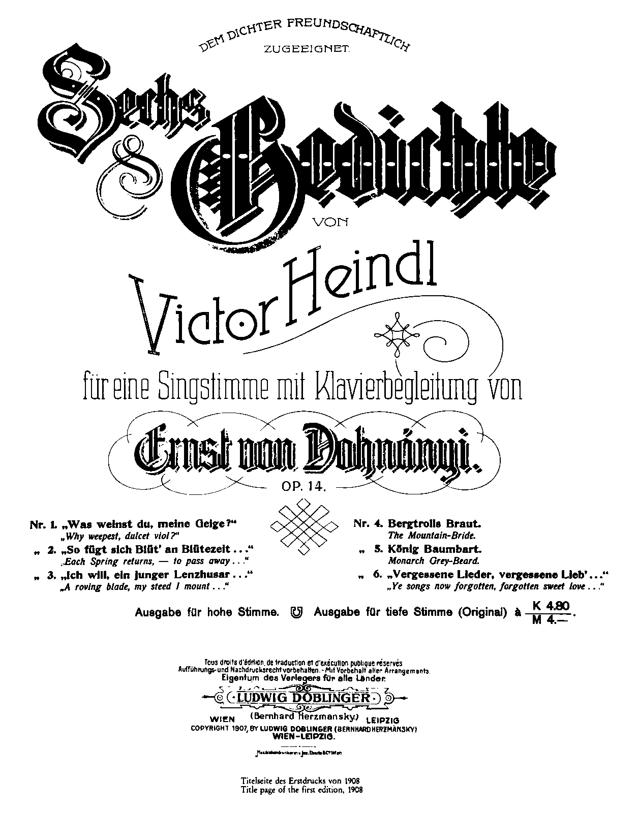 | Dedication | Dem Dichter Freundschaftlich (Viktor Heindl) |