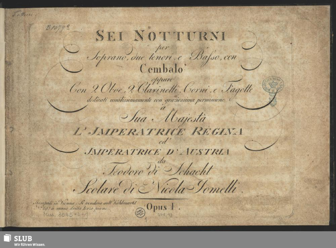 | Alternative. Title | Sei Notturni per Soprano, due tenori, e Basso, con Cembalo oppure con 2 Oboe, 2 Clarinetti, Corni, e Fagotte |