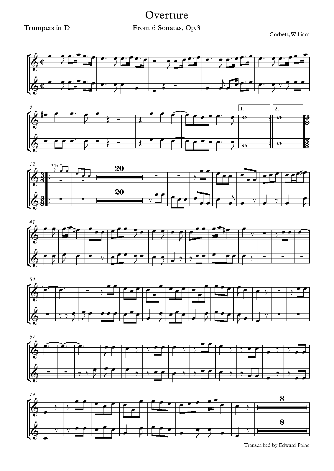 trumpet (or oboe), 2 violins, continuo; 2 trumpets (or oboes), 2 violins, viola, continuo
