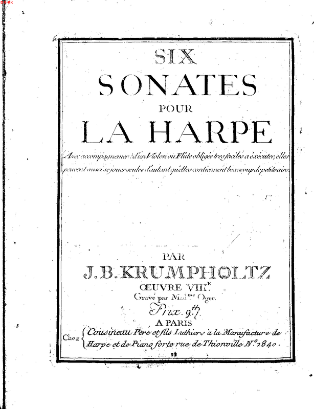 | Alternative. Title | Six sonates pour la harpe avec accompagnement d'un violon ou flute obligee tres faciles a executer, elles peuvent aussi se jouer seules d'autant qu'elles contiennent beaucoup de petits airs. |