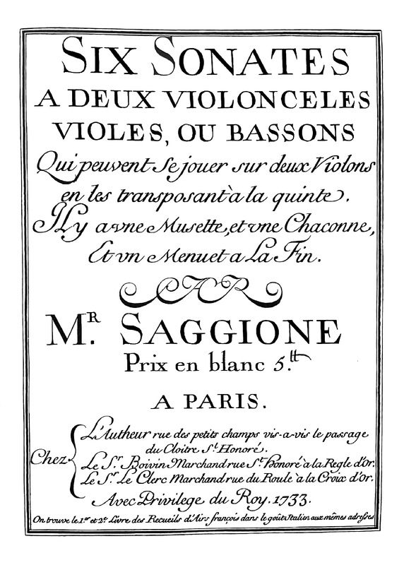 Alternative. Title Six Sonates à Deux Violoncelles, Violes, ou Bassons, qui peuvent se jouer sur deux Violons en les transposant à la quinte. Il y a une Musette, et une Chaconne, et un Menuet a la Fin. Par Mr. Saggione