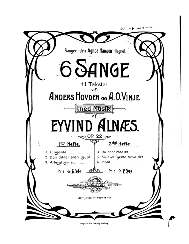 | Librettist | Anders Hovden (1860–1943) (Nos.1, 6) Aasmund Olavsson Vinje (1818–1870) (Nos.2-5) |