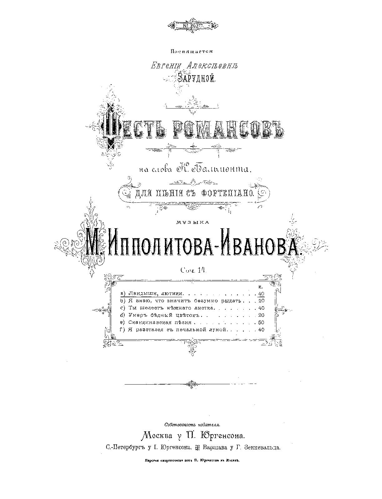 ⇒ 5 more: 2. Я знаю, что значит безумно рыдать... • 3. Ты шелест нежного листка • 4. Умер бедный цветок • 5. Скандинавская песня • 6. Я расстался с печальной луной