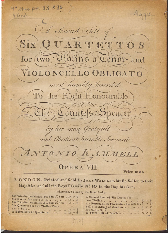 | Alternative. Title | A Second Sett of Six Quartettos for two Violins, a Tenor and Violoncello Obligato |