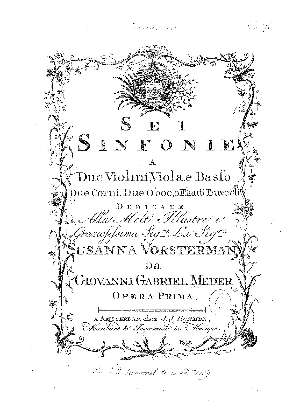 | Alternative. Title | Sei Sinfonie a Due Violini, Viola, e Basso. Due Corni, Due Oboe, o Flauti Traversi |