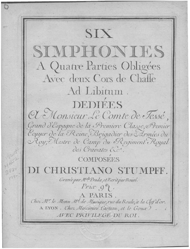 | Alternative. Title | Six simphonies à quatre parties obligées, avec deux cors de chasse ad libitum |