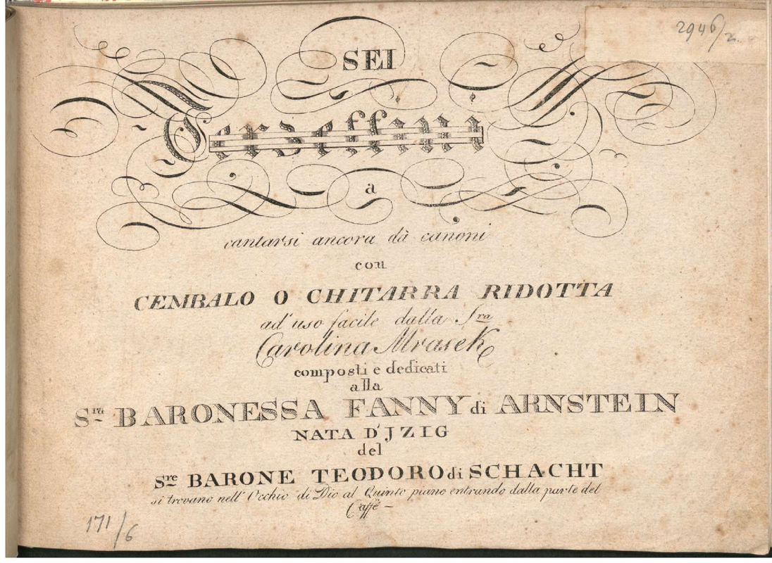 | Alternative. Title | Sei Terzettini a cantarsi ancora da canoni con cembalo o chitarra ridotta ad uso facile dalla Sra Carolina Mrasek, composti ... del Sre Barone Teodoro di Schacht |