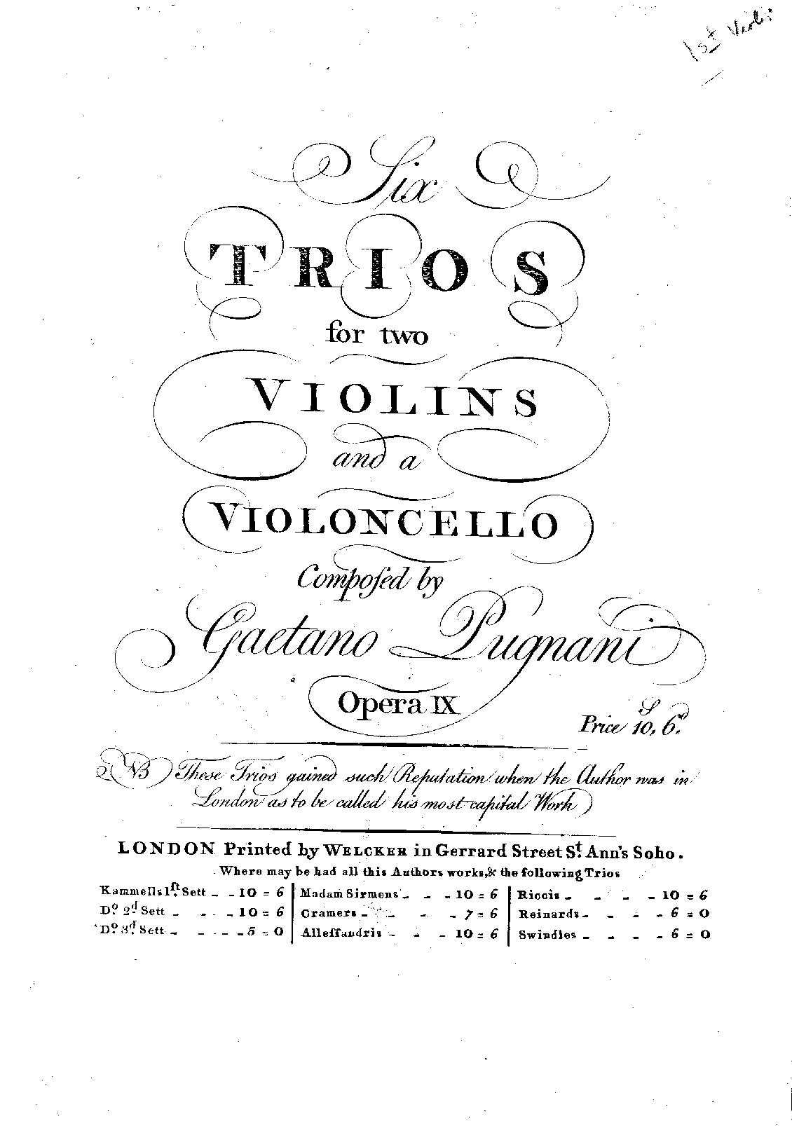 "N.B. These Trios gained such Reputation when the Author was in London as to be called his most capital work."