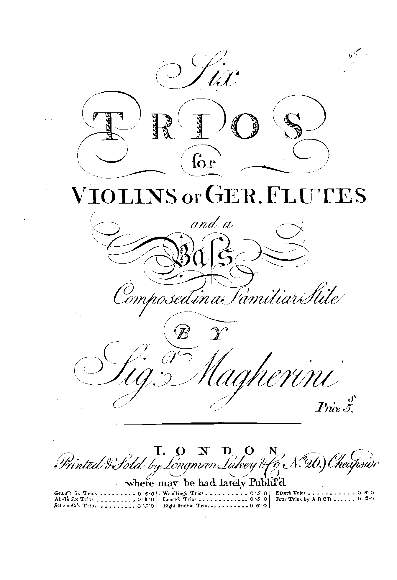 | Work Title | Six trios for violins or Ger. flutes and a bass. Composed in a familiar stile by Sigr. Magherini |