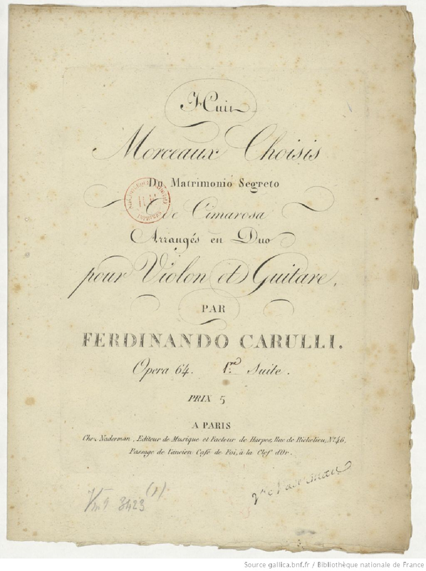 | Alternative. Title | 8 Morceaux choisis du Matrimonis segreto de Cimarosa arrangés en duo pour Violon et Guitare |