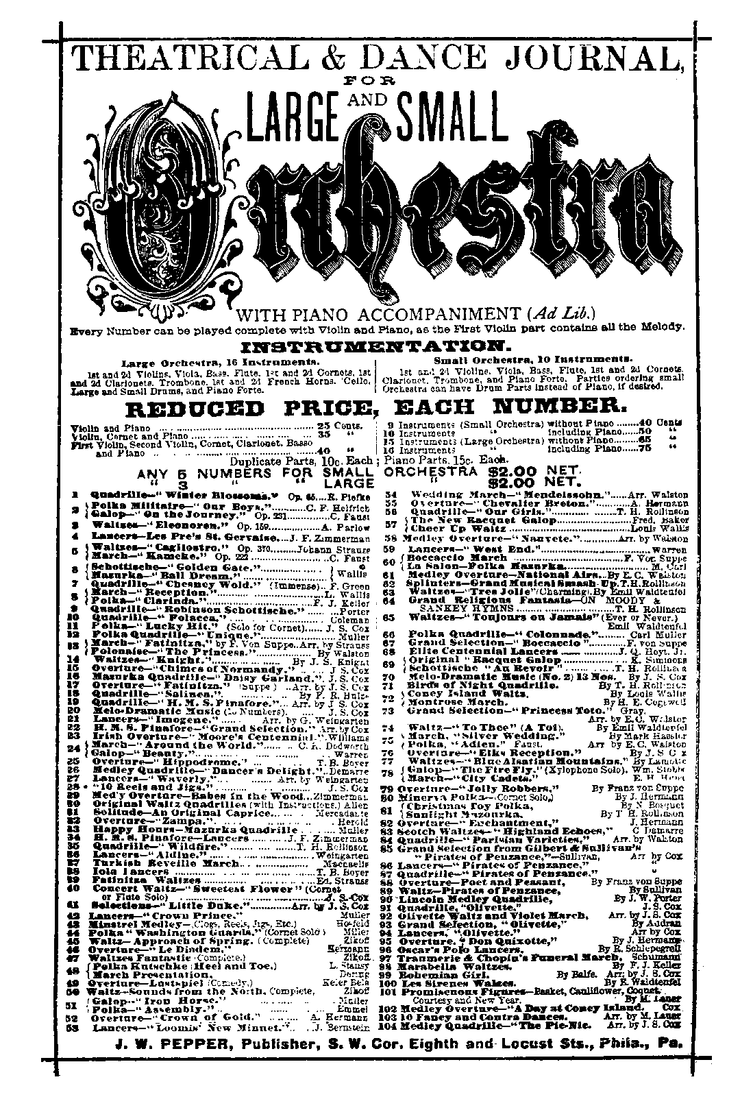 | Instrumentation | Orchestra (small): flute (or piccolo), clarinet (C) + 2 cornets (B♭), trombone + piano (ad lib.) + strings Orchestra (large): added parts for clarinet 2, 2 horns, drums (often including triangle), cello |