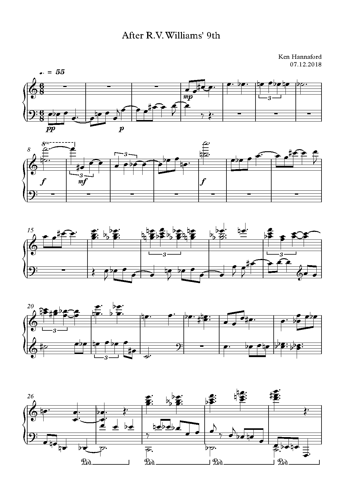 This music was written after completing the 2 piano arrangement of the 1st and 4th movements of RVW's Symphony No 9, exploring with 21st century ears the rhythms and harmonies implicit in the opening melodic curve.