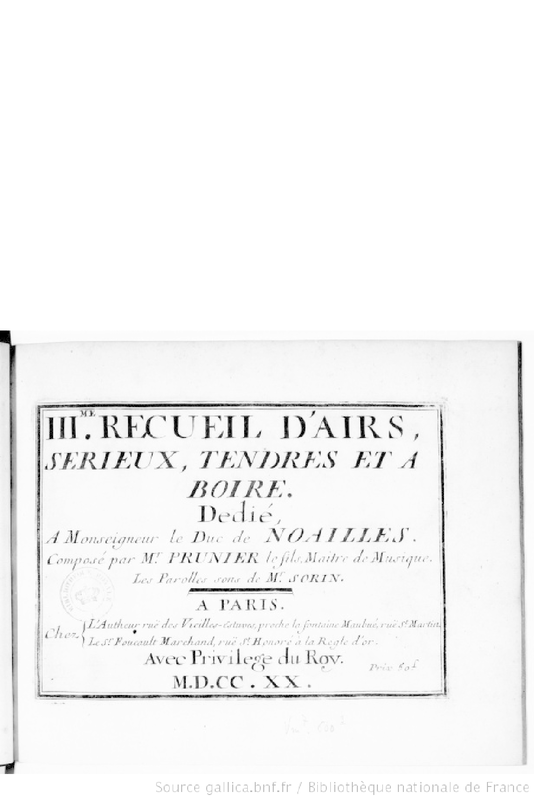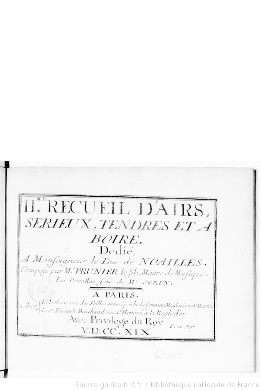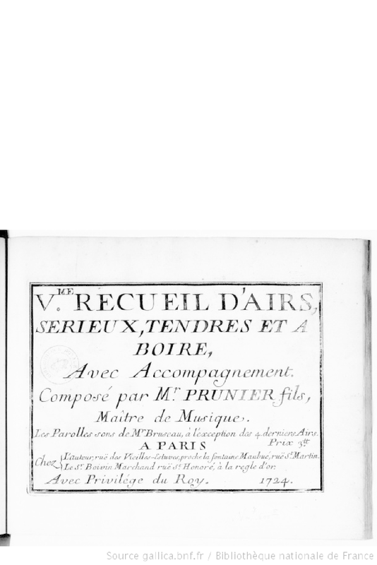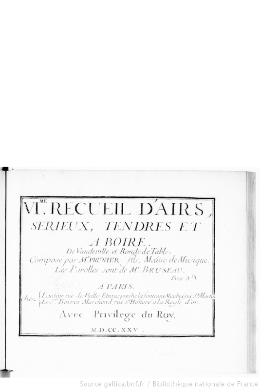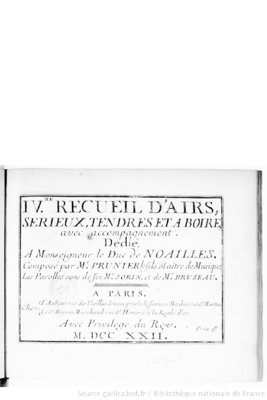 | Librettist | M. Sorin (Recueils 2-4) M. Bruseau (Recueils 4-6, excepting the last 4 airs of Recueil 5) |