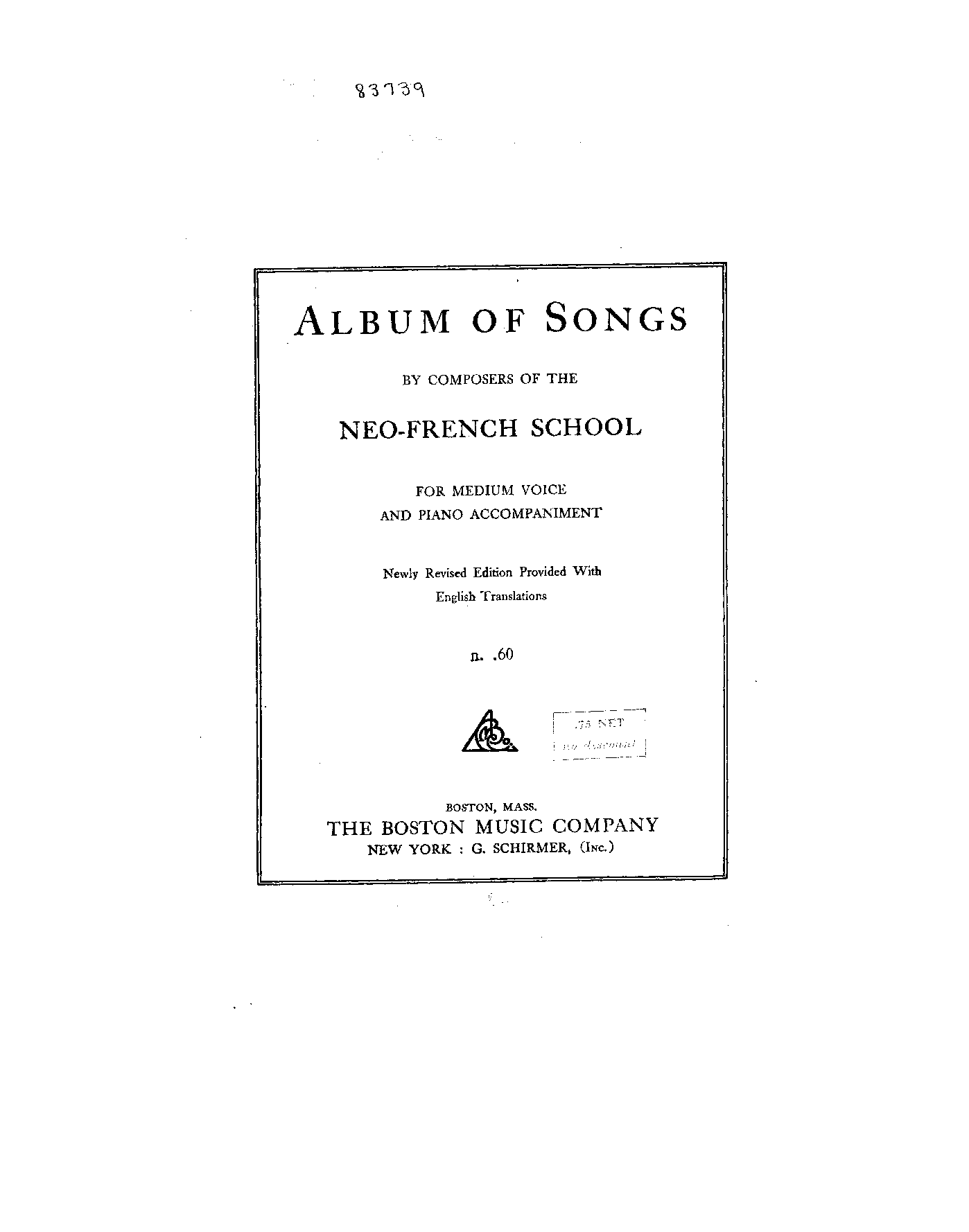 Work Title Album Of Songs By Composers Of The Neo-French School