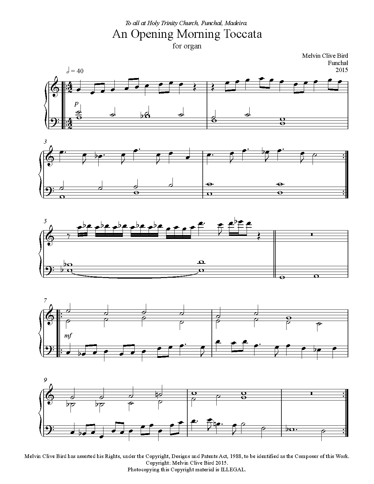 Melvin Bird has asserted his right under the Copyright, Designs and Patents Act, 1988, to be identified as the composer of this work. Please contact the composer for further information. The composer welcomes any performances and recordings. melvin.bird@hotmail.com. A clear and clean text.